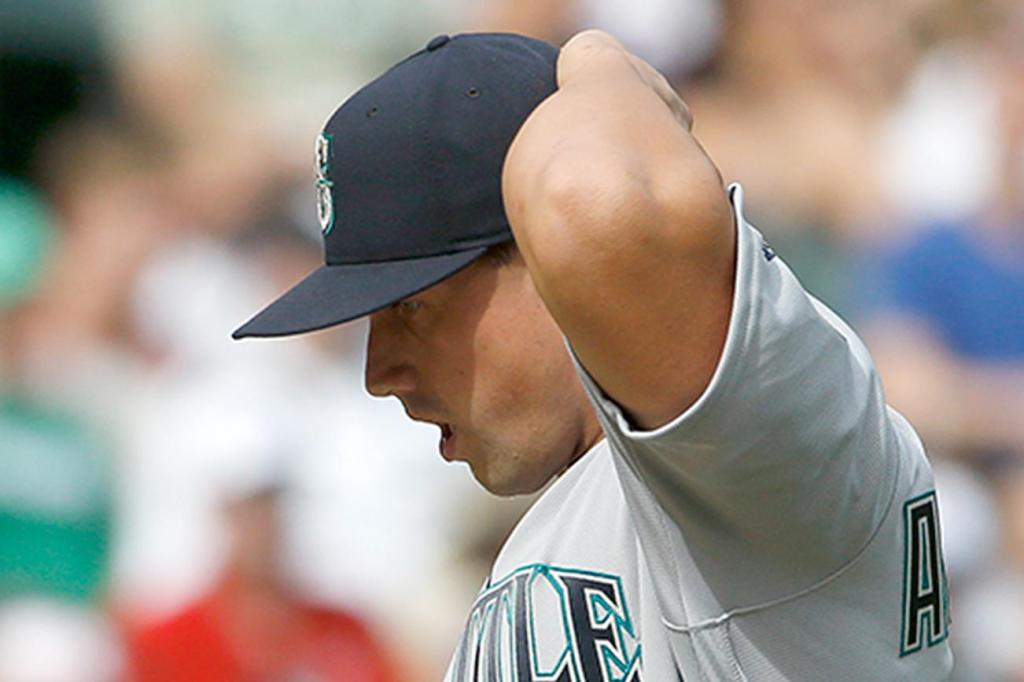 The Associated Press Seattle Mariners relief pitcher Dan Altavilla reacts as he walks to the dugout after the eighth inning of a baseball game against the Chicago White Sox in Chicago, Sunday.