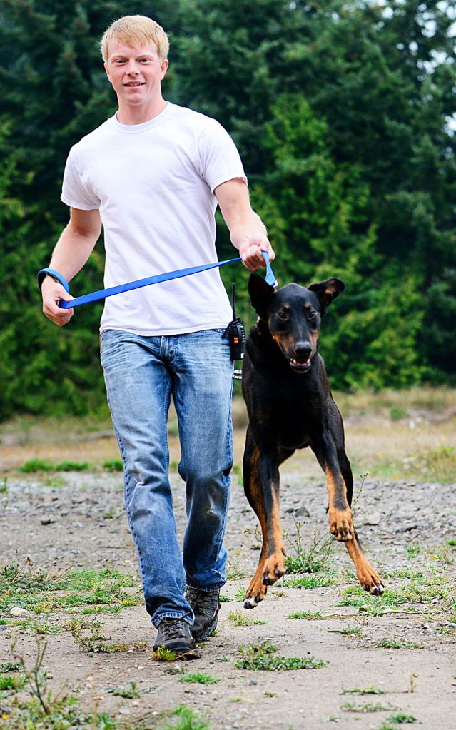 Jesse Turney, kennel tech at Olympic Peninsula Humane Society, plays with Jackson, a 1-year-old Doberman mix that the humane society spent thousands of dollars on in order to rehabilitate. (Jesse Major/Peninsula Daily News)