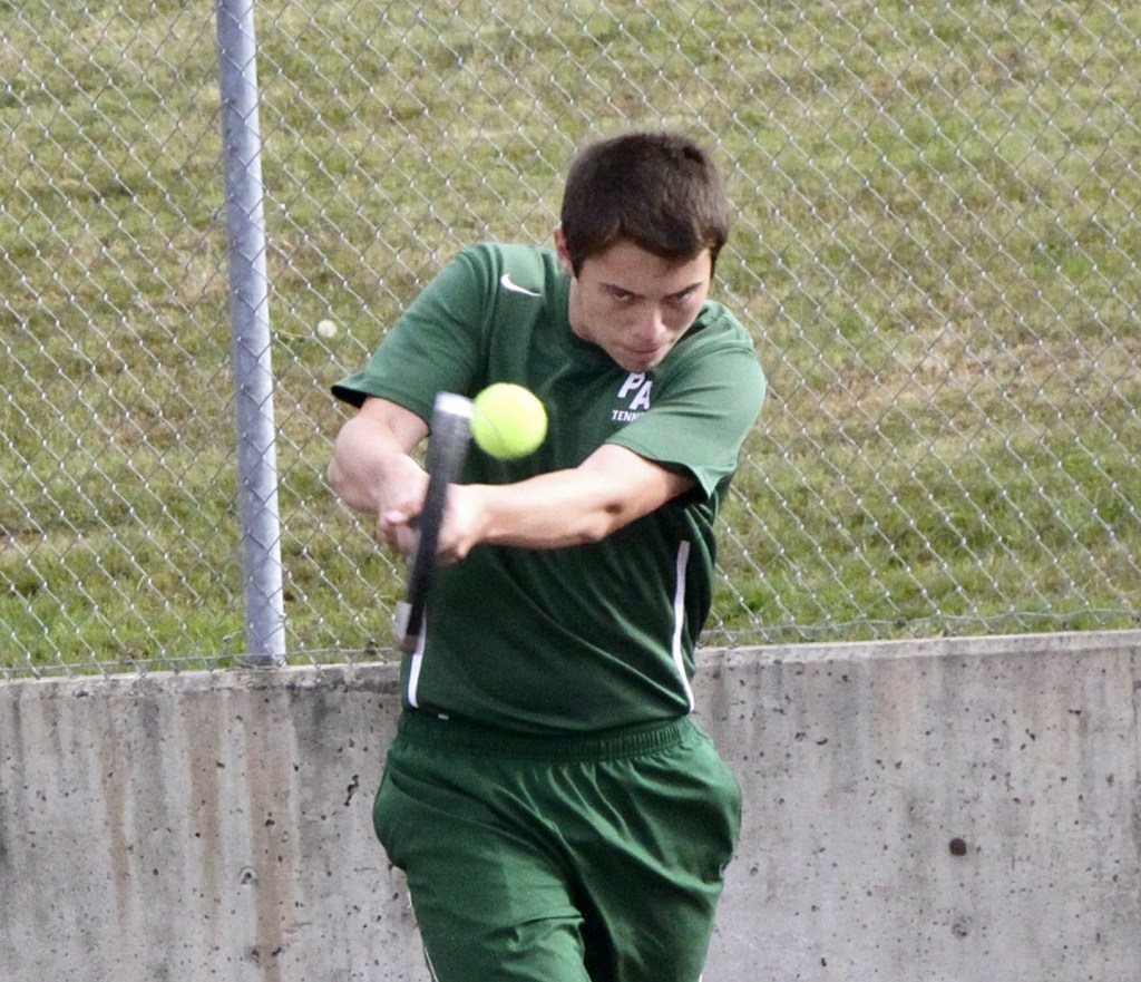 Dave Logan/for Peninsula Daily News                                Port Angeles’ No. 2 singles player Tyler Nickerson hits a return during his match against Chimacum’s Nate Miller. Nickerson won 6-0, 6-2.