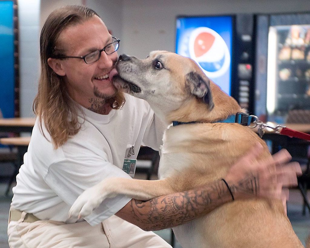 The dogs bounded into the visit room at the mixed-custody prison Wednesday for a reunion with their inmate handlers.