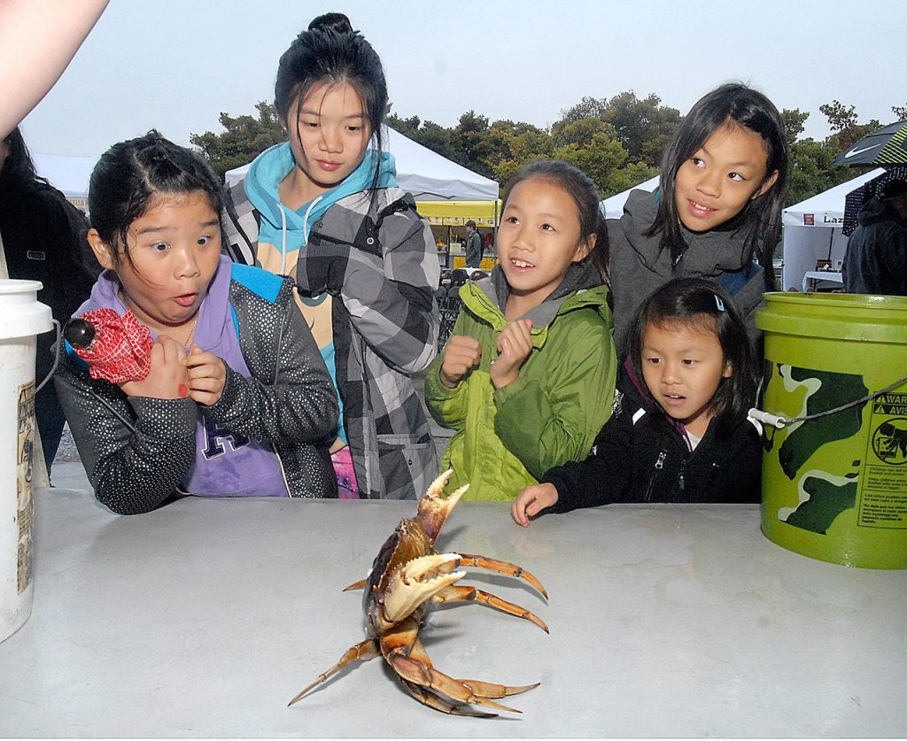 Crab Festival visitors, from left, Anabelle Chui, 9, Faustina Chui, 12, Matteah Cho, 8, Kiyah Cho, 10, and Ella Cho, 5, all from Vancouver, B.C., examine a live crab at Saturday’s crab derby, a signature event of the Dungeness Crab & Seafood Festival in Port Angeles. (Keith Thorpe/Peninsula Daily News)