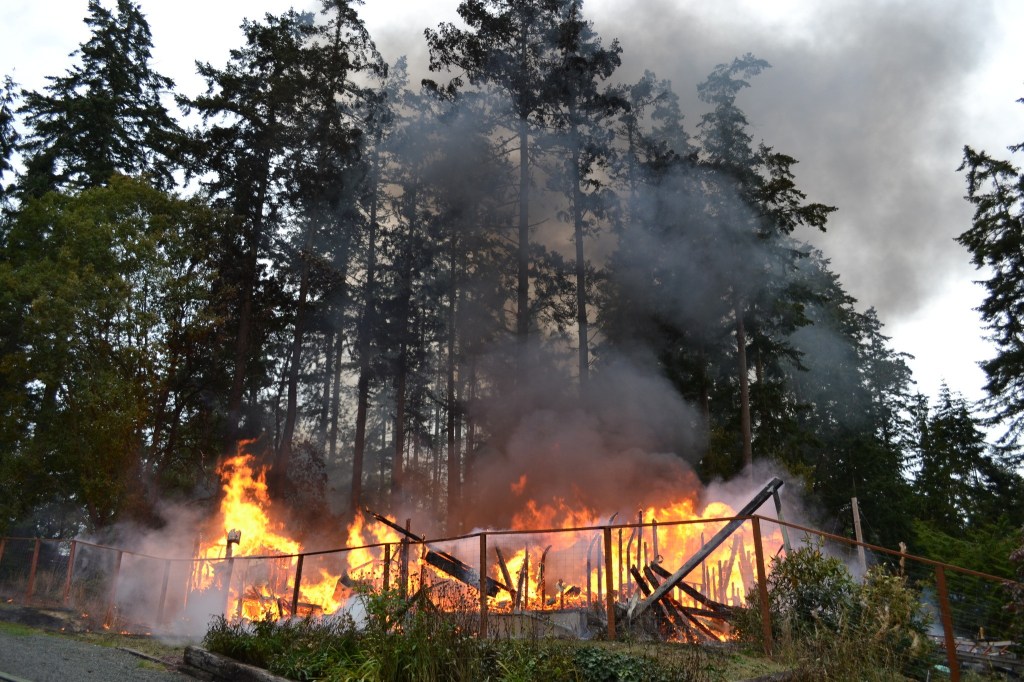 According to Bill Beezley, East Jefferson Fire-Rescue spokesman, Fire-Rescue and Port Ludlow fire crews responded to a call at 4:30 p.m. to find a roughly 25-foot-by-15-foot outbuilding — similar to a large garage of workshop — engulfed in flames.