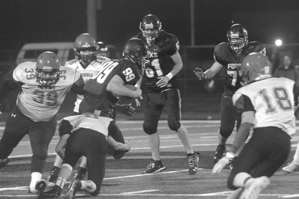 Lonnie Archibald/for Peninsula Daily News                                Forks’ Jack Dahlgren (99) runs through Neah Bay defenders Curtis LaChester (39) Cole Svec (16) and Logan Halttunen (8) and Josey Tyree (18) on his way to a big gain earlier this season. The Spartans host Hoquiam tonight with a shot at the Evergreen League’s second seed to the district playoffs.