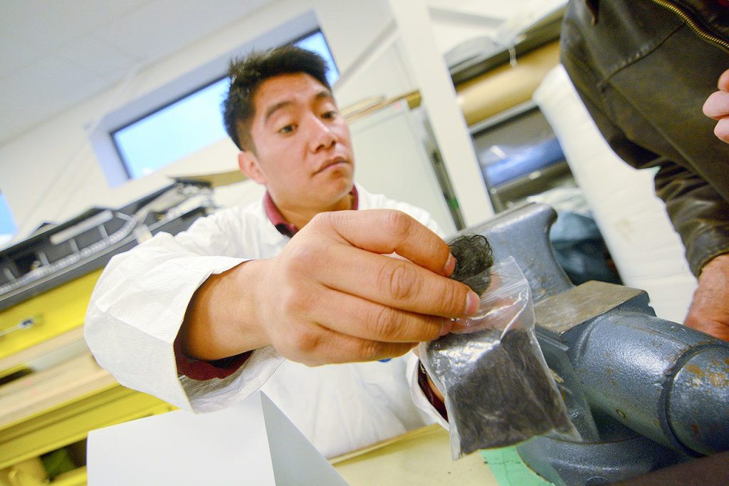 Juan Juan, a second-year Peninsula College student in the advanced manufacturing program, shows some recycled carbon fiber during an open house at the Composite Recycling Technology Center in Port Angeles on Tuesday evening. (Jesse Major/Peninsula Daily News)