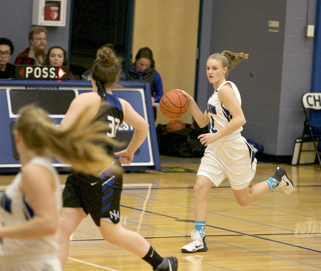 Steve Mullensky/for Peninsula Daily News                                Chimacum’s Jada Trafton drives downcourt against North Mason during the Cowboys’ 50-47 overtime win Monday in Chimacum.                                Steve Mullensky/for Peninsula Daily News Chimacum’s Jada Trafton drives downcourt against North Mason during the Cowboys’ 50-47 overtime win Monday in Chimacum.