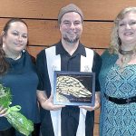 Last year’s Angel of the Arts award recipients Selena and Louie Espinoza pose with their award and Arts Commission member Lisa Wentworth. (Port Townsend Arts Commission)