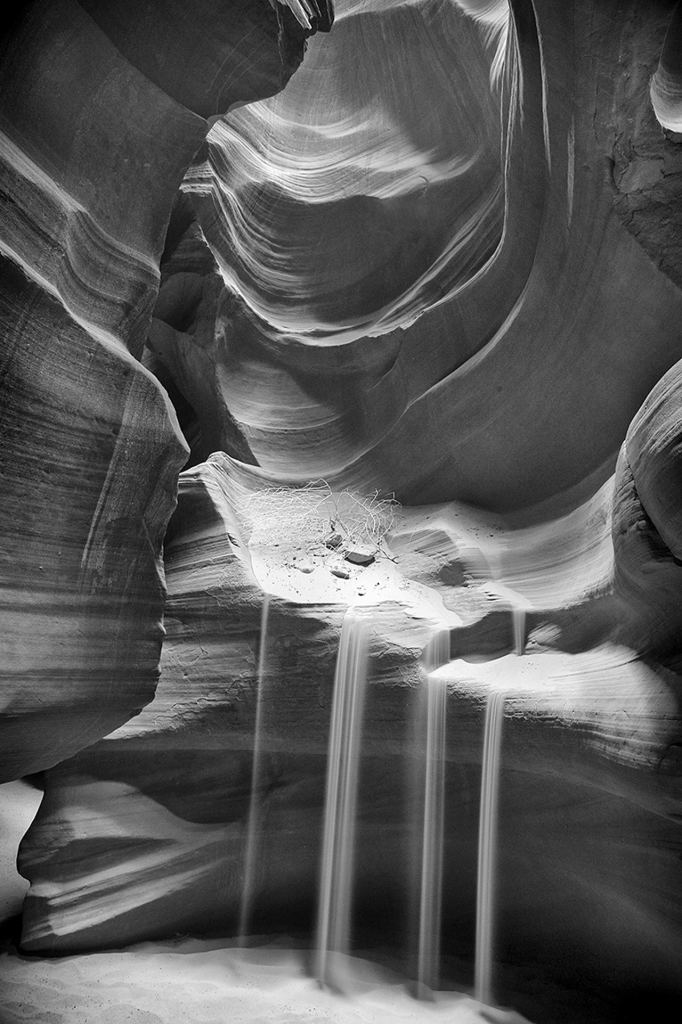 “The bold graphic punch of black and white that stimulates and sharpens the mind is modified by soft tones of grey, which lull one into a reflective meditative mood. This dichotomy asks what is going on here?”