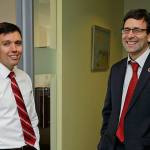 Washington state Solicitor General Noah Purcell, left, and Attorney General Bob Ferguson, right, pose Friday next to their adjoining offices in Seattle. (Ted S. Warren/The Associated Press)
