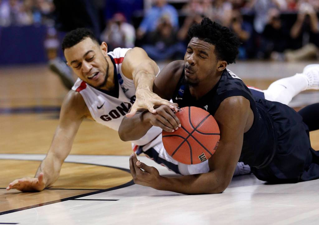 Xavier guard Quentin Goodin, right, grabs a loose ball next to Gonzaga guard Nigel Williams-Goss during the first half of an NCAA Tournament college basketball regional final game Saturday, March 25, 2017, in San Jose, Calif. (AP Photo/Tony Avelar)