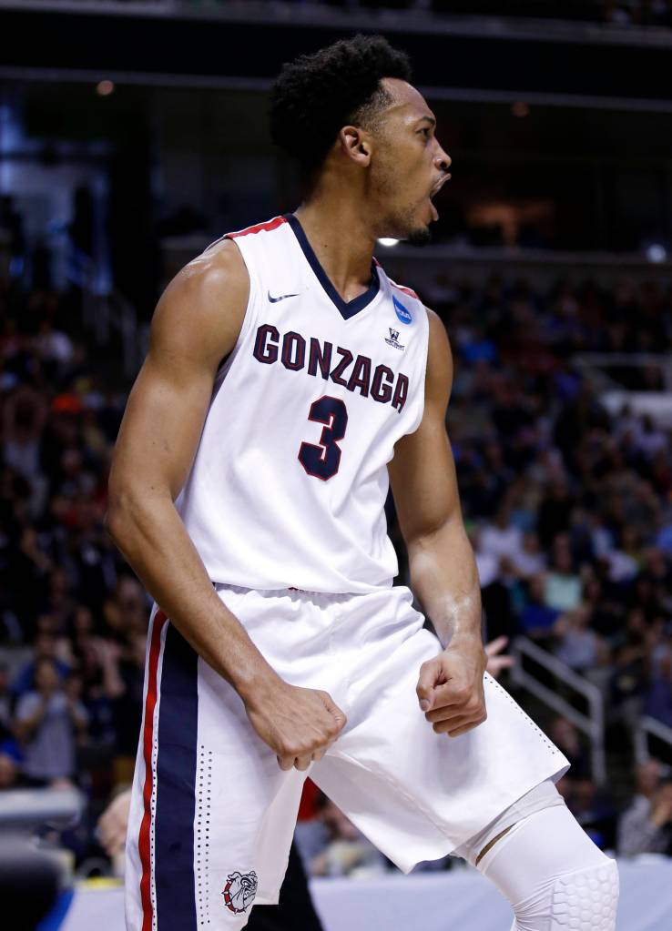Gonzaga forward Johnathan Williams (3) celebrates after scoring against Xavier during the first half of an NCAA Tournament college basketball regional final game Saturday, March 25, 2017, in San Jose, Calif. (AP Photo/Tony Avelar)