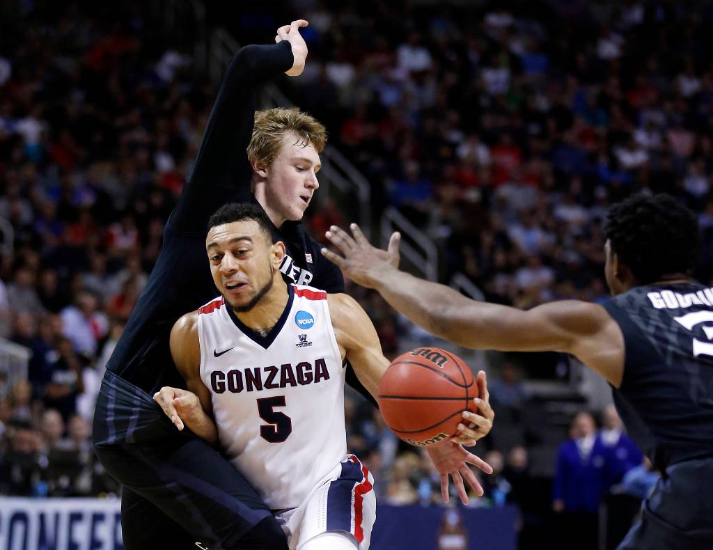 Gonzaga guard Nigel Williams-Goss, center, right, shoots over Xavier’s Sean O’Mara, center left, during the first half of an NCAA Tournament college basketball regional final game Saturday, March 25, 2017, in San Jose, Calif. (AP Photo/Tony Avelar)