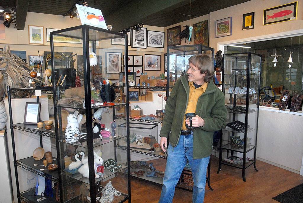 Port Angeles photographer Eric Neurath examines a display case containing works created by a consortium of area artists who operate the Harbor Art Gallery at 110 Railroad Ave., one of several businesses that would be displaced by the construction of a proposed hotel by the Lower Elwha Klallam Tribe. (Keith Thorpe/Peninsula Daily News)
