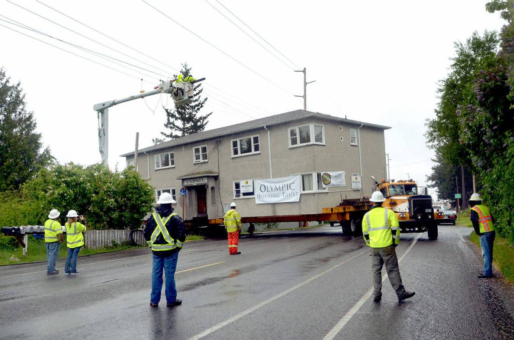 Trucks from the Jefferson County Public Utility District, Wave Cable and CenturyLink were sent ahead of the truck hauling the apartment to take down some of the low-hanging power lines on the route through town.