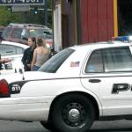 Port Angeles Police Officer Brian Stamon, left, and Sgt. Kori Malone interview a witness to an armed robbery Friday afternoon at The Daily Grind coffee stand at 1919 E. First St. in Port Angeles. (Keith Thorpe/Peninsula Daily News)