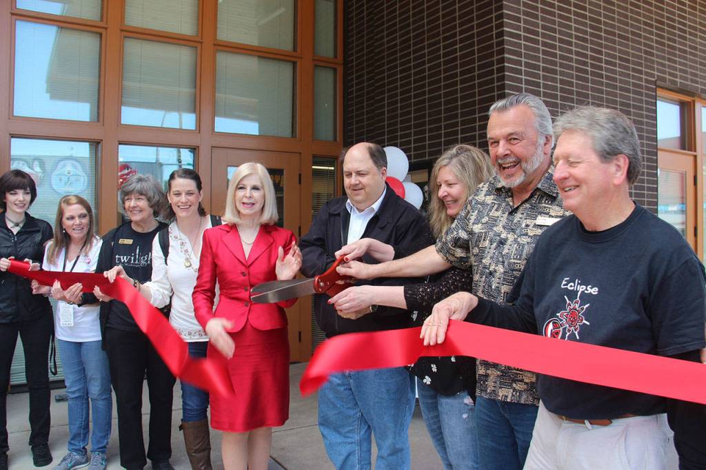 From left, Jessica Hagen, Kelly Grable, Forks Visitor Information Center volunteer Marcia Yanish, Katryna Harris, Port Angeles Deputy Mayor Cherie Kidd, Forks Mayor Bryon Monohon, Forks Chamber of Commerce Executive Director Lissy Andros, Forks Chamber of Commerce President Don Grafstrom and Mike Gurling take part in a ribbon cutting Saturday for the Forever Twilight in Forks Collection at the Rainforest Arts Center. Hagen plays Alice Cullen from the Twilight series during the Forever Twilight in Forks Festival. Grable and Harris are Twilight fans who live out of the area and assisted with getting the collection ready, while Gurling worked with the Visitor Information Center when Twilight started gaining popularity. (Christi Baron/Olympic Peninsula News Group)