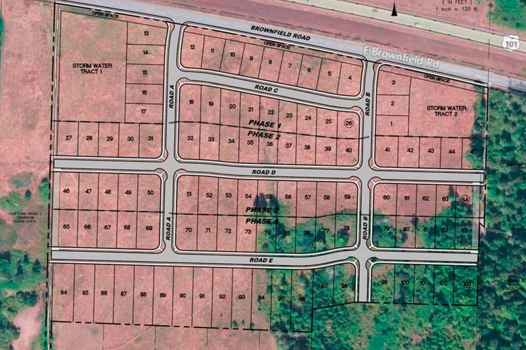 The first phase would include 26 homes adjacent to Brownfield Road, while the second phase would mean building 38 homes in the middle of the property. Phase 3 would bring in 39 homes.
