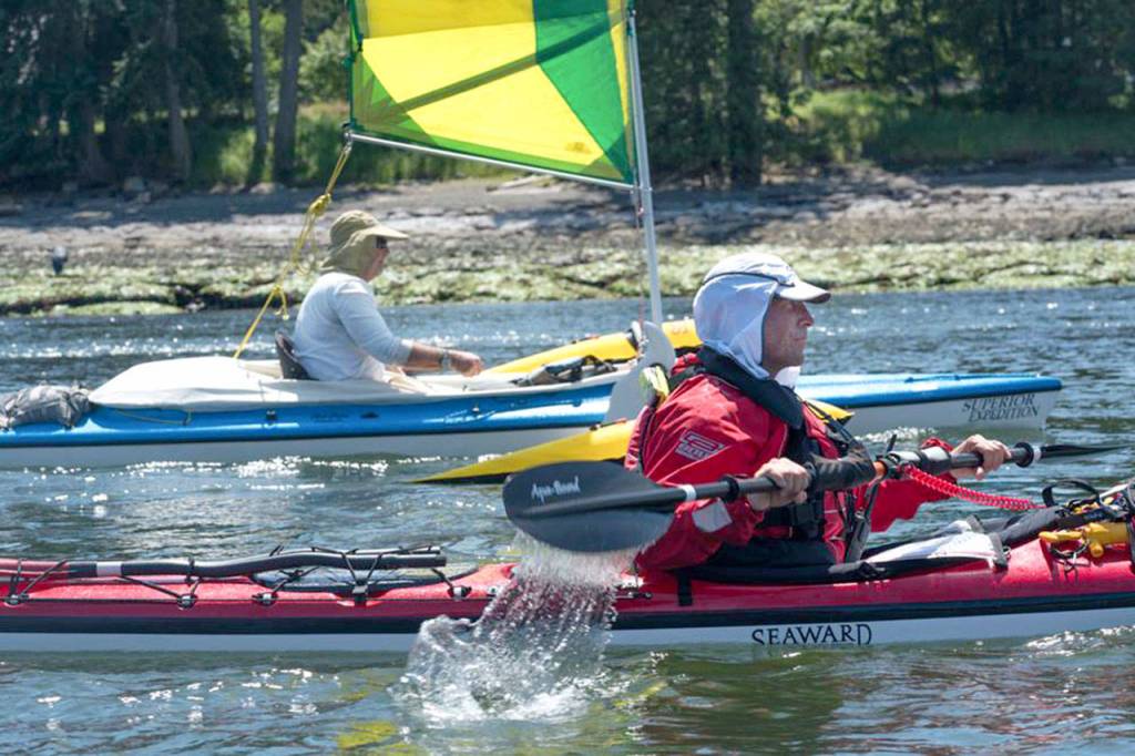 Viz Reporter is a solo kayaker and Rod Price is canoeing with the help of some inflatable outriggers and a small sail.
