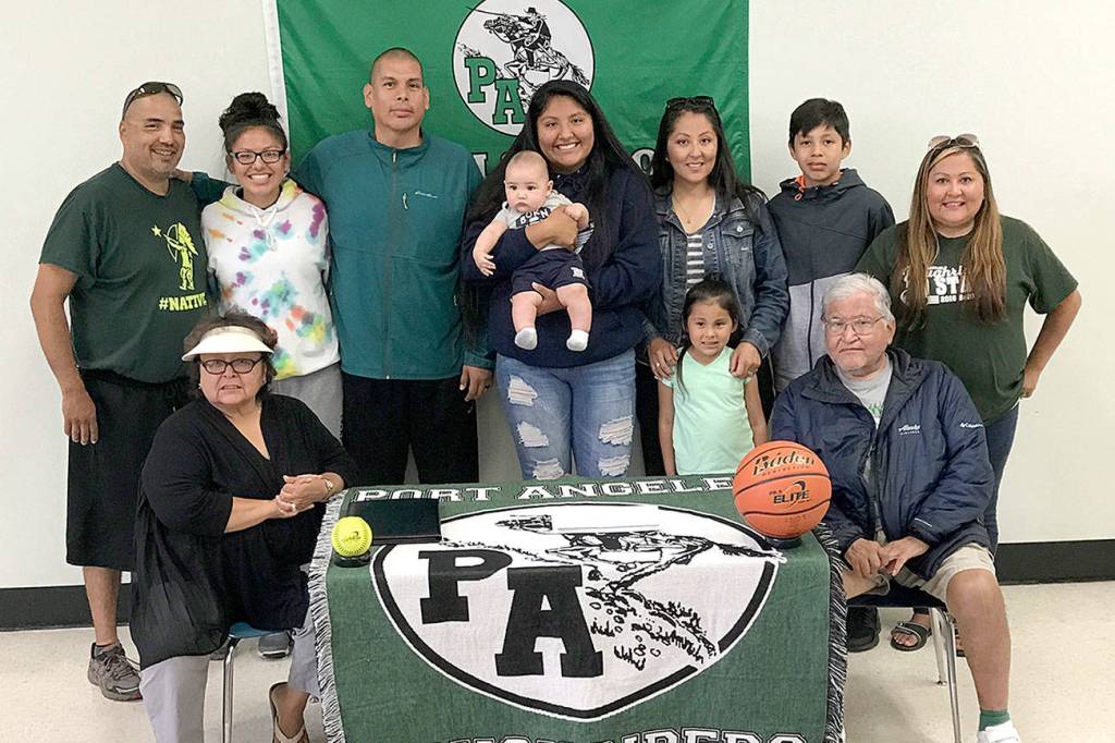 Port Angeles Roughrider Nizhoni Wheeler’s family was on-hand Friday as she signed a letter of intent to play both basketball and softball at Lower Columbia Community College in Longview. Wheeler was an all-Olympic league basketball player for the Roughriders her senior season and she was the Olympic League 2A Division MVP in softball. From left back row are Lester Moses, Cheyenne Wheeler, Jason Wheeler, Nizhoni Wheeler, Jarison Moses, Rachelle Wheeler, Skylar Wheeler, Quanah Wheeler and Michelle Charles. Sitting, from left, are Alyce Charles and Frank Charles.
