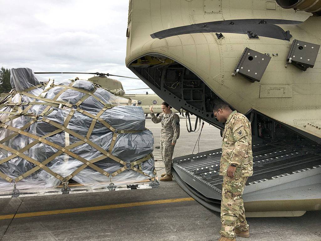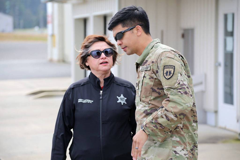 One thing that the county has been working on is establishing Community Points of Distribution (CPOD), a place the public goes to pick up emergency supplies following a disaster. Members of the Guard joined volunteers at the Clallam County Fairgrounds to set up the potential distribution area.
