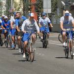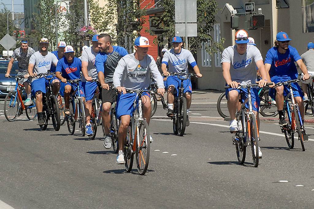 Keith Thorpe/Peninsula Daily News Members of the Port Angeles Lefties baseball team ride bicycles in the 100 block of West First Street in downtown Port Angeles on Thursday to promote their upcoming “Bike to a Ballgame” night, scheduled for July 15. The team, an affiliate of the West Coast League, is encouraging fans to ride their bicycles to the game, a matchup with the Corvallis Knights at Port Angeles Civic Field. Gametime is 6:45 p.m.