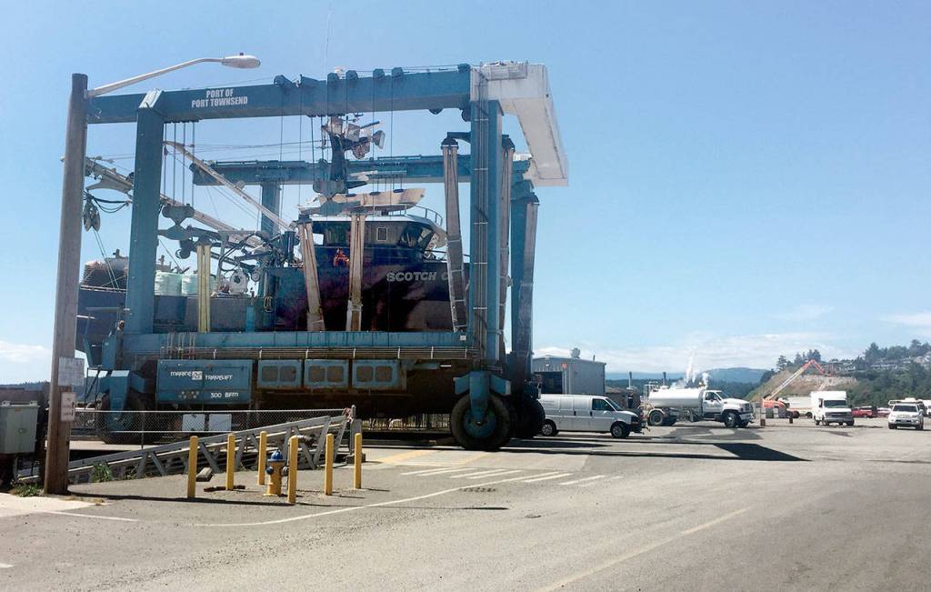 A lift carries a fishing boat across the workyard at Boat Haven Marina. The yard is scheduled to be resurfaced by Sept. 1 to cut down on dust. (Cydney McFarland/Peninsula Daily News)
