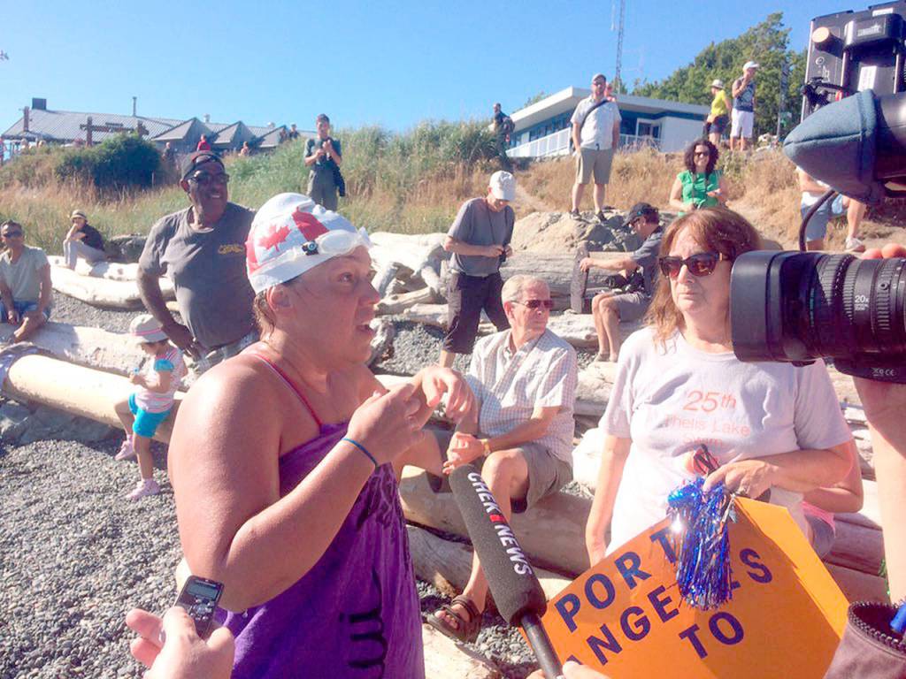 Only seven weeks after leg surgery, Jill Yoneda of Victoria swam the 18.5 miles from Dungeness Spit to Victoria’s Clover Point on Monday, becoming the 12th person known to have completed the swim.