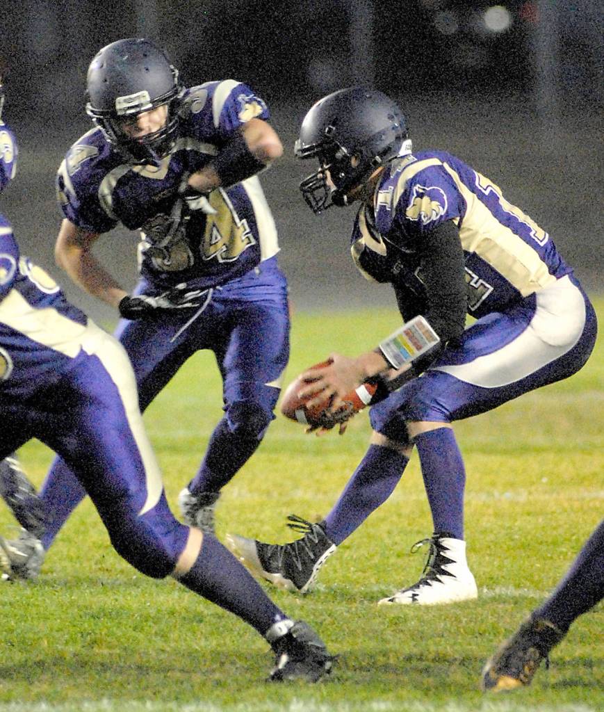 Sequim quarterback Riley Cowan, right, hands off to running back Hayden Gresli during a game against North Kitsap last season.                                Keith Thorpe/Peninsula Daily News