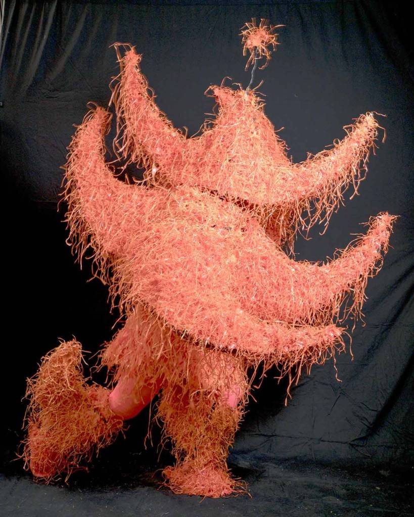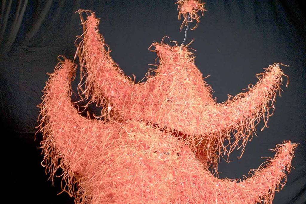 Margie McDonald created “Thorned Orange Biped” from pulled plastic fencing tagged onto a foam mat, which she glued and sewed together. (Philip Baumgaertner)