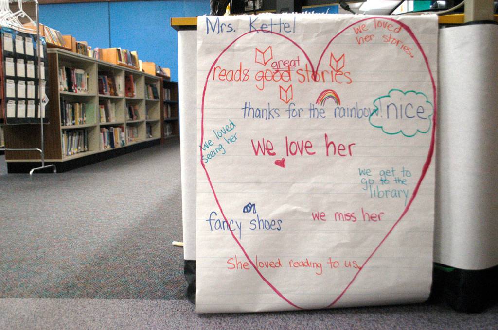 Children wrote notes and printed photographs of Kettel. Kindergartners sprinkled paper hearts with “lots of glitter.” Students drew pictures of Mrs. Kettel and their favorite books.