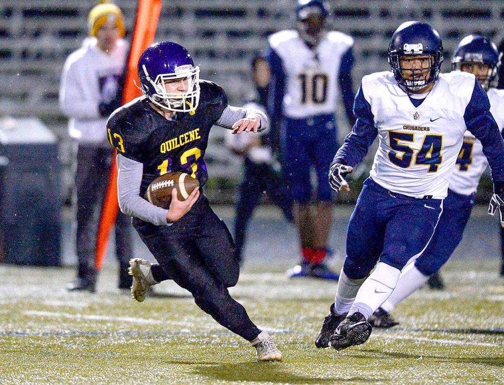 After a back-and-forth first quarter that saw Tacoma Baptist’s speedy playmaker P.J. Talen score on a 59-yard touchdown run and a 61-yard pass reception from Noah Tangen, Quilcene led 16-14 thanks to touchdown runs of 24 and 23 yards by Quilcene’s Andy Johnston and Eli Mahan.