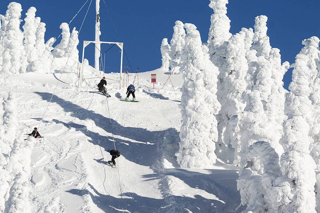 Snowboarders use a rope tow at Hurricane Ridge in 2016. (Jesse Major/Peninsula Daily News)