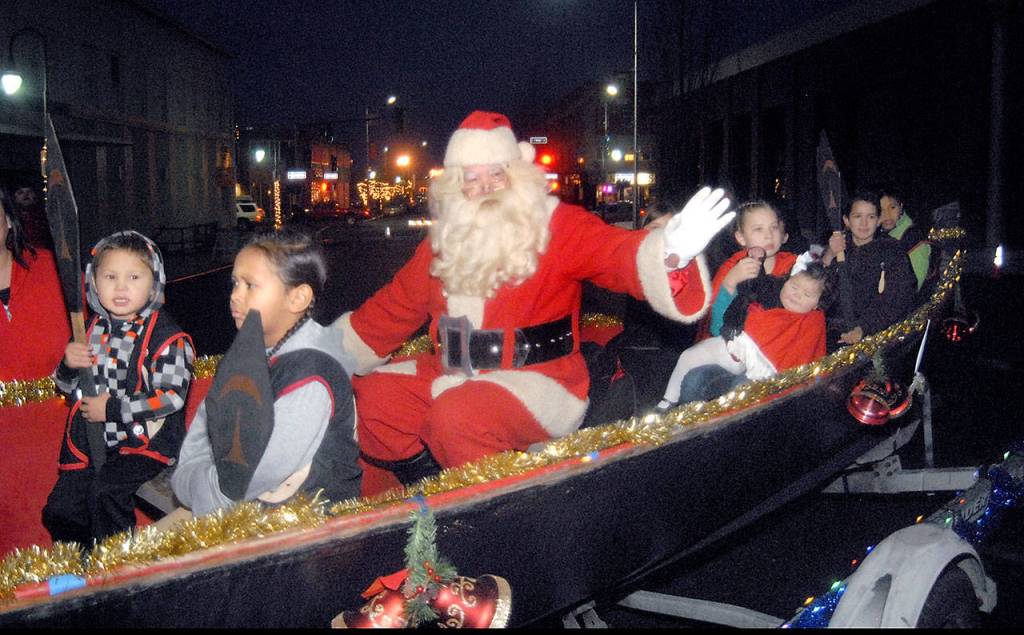 Santa Claus, portrayed by John Hubbard, accompanied by young pullers, arrives in a canoe owned by the Lower Elwha Klallam Tribe during a Christmas season kickoff on North Laurel Street in downtown Port Angeles on Saturday.