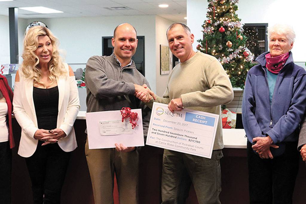 SEQUIM — Members of the Sequim Picklers have presented the city of Sequim with a check for $217,700 to contribute to the construction of eight tournament-quality pickleball courts at Carrie Blake Community Park.