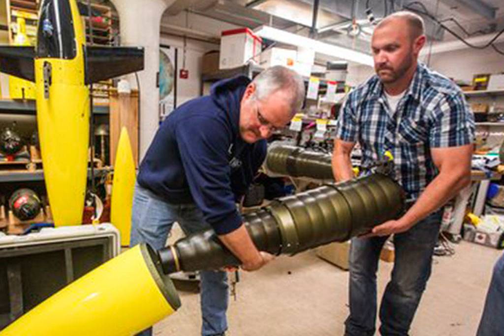 In a Nov. 20 photo, University of Washington oceanographers Jason Gobat and Ben Jokinen load the “pupa” into the underwater fairing “sea glider” that will be used in an antarctic expedition to gather data under the sea ice sheets to estimate future melting and sea level rise. (Steve Ringman/The Seattle Times via AP)