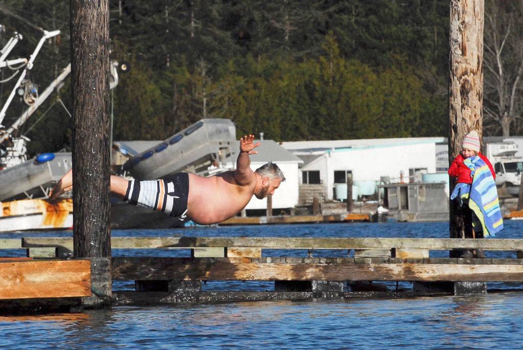 NORDLAND — At high noon Monday, 100 hearty souls ignored the temperature, took a breath then jumped from a dock during the annual polar bear dip in front of the Nordland General Store on Marrowstone Island.