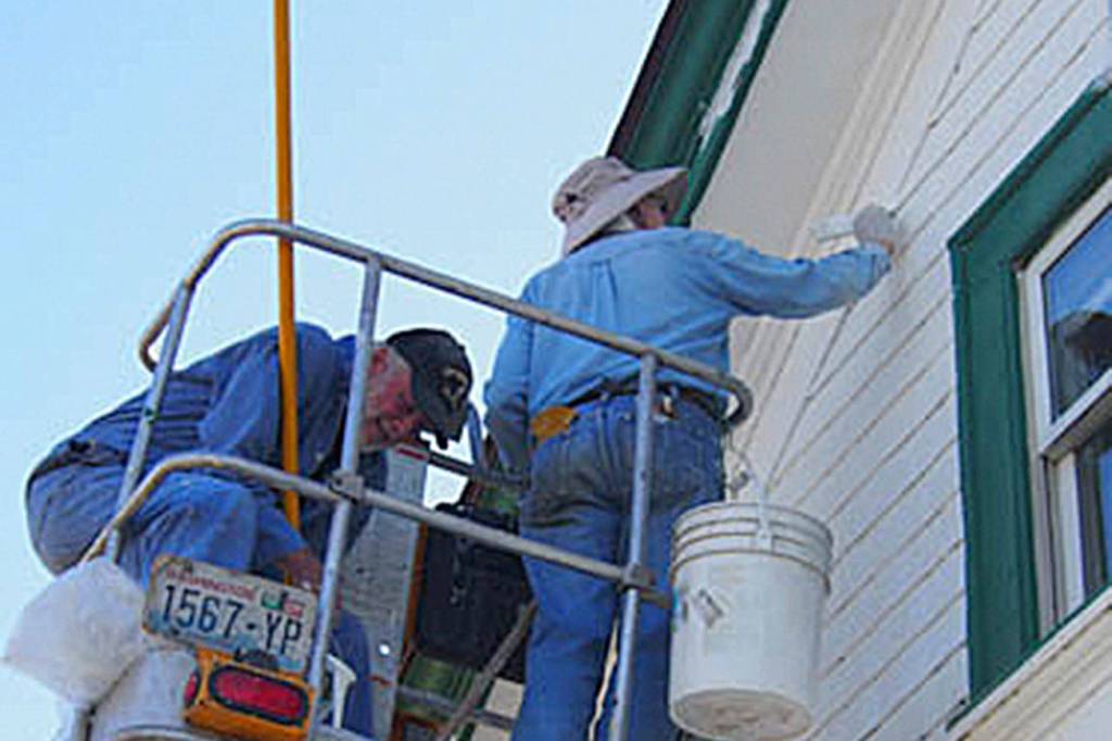 An all-volunteer group takes part in a recent work party, prepping one of the buildings at the New Dungeness Lighthouse for a fresh coat of paint.