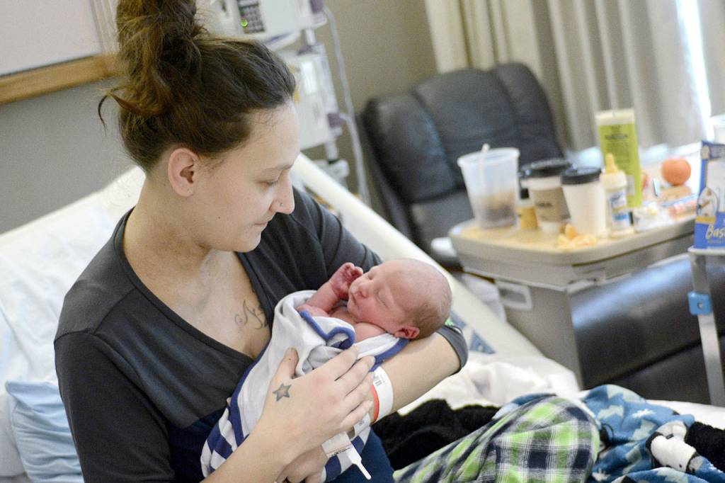 Shelby Thompson of Port Hadlock holds her new baby boy who was born Thursday. He was the first baby born in Jefferson County this year. (Jesse Major/Peninsula Daily News)