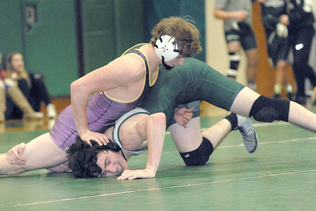 Last year’s 106-pound Class 1A state champion Josue Lucas, now wrestling at 113, showed off some acrobatic moves in picking up a win by pin at 1:48 of his match with Port Townsend’s Carter Swartout and a 17-2 technical fall victory against Port Angeles’ Scott Hedin. He also won by forfeit against Sequim.