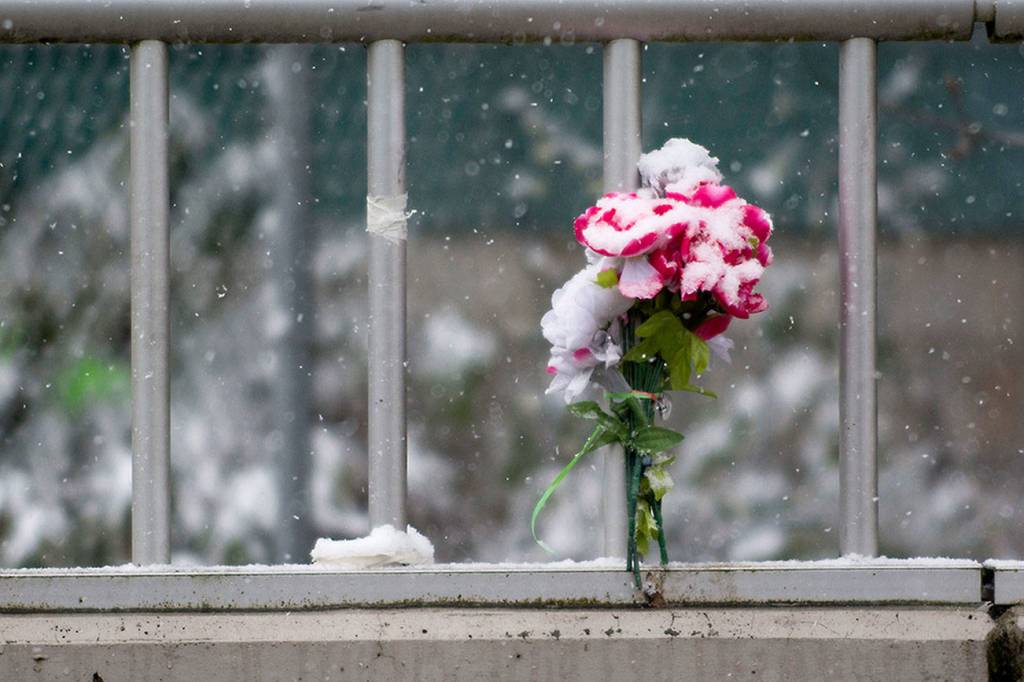 Snow-covered flowers sit on the edge of the eastern Eighth Street Bridge in Port Angeles on Wednesday. The state House and Senate draft transportation budgets include funding to help build suicide barriers on both of the bridges. (Jesse Major/Peninsula Daily News)