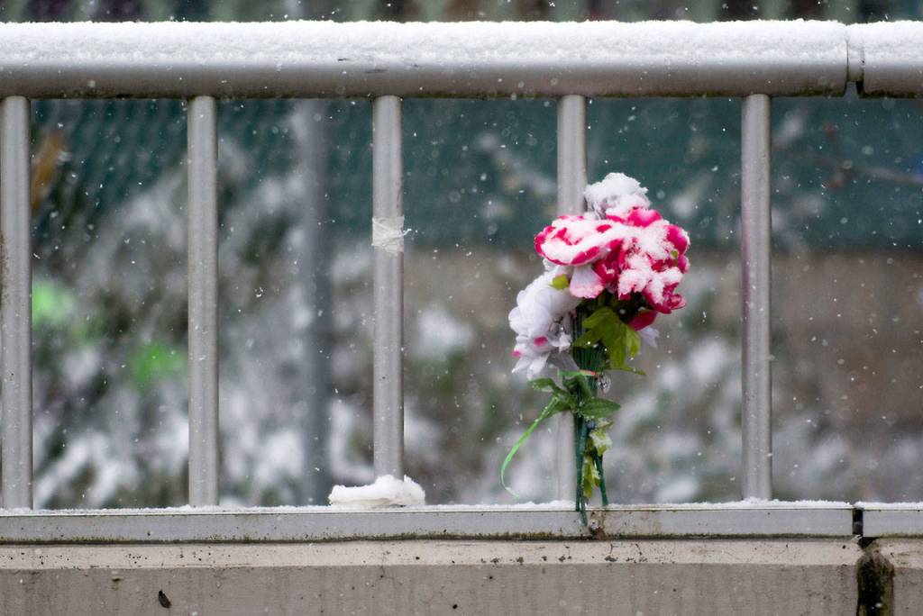 Wishart’s death sparked protests calling on the city to add fencing. Flowers still remain on the bridge she jumped from three months ago.