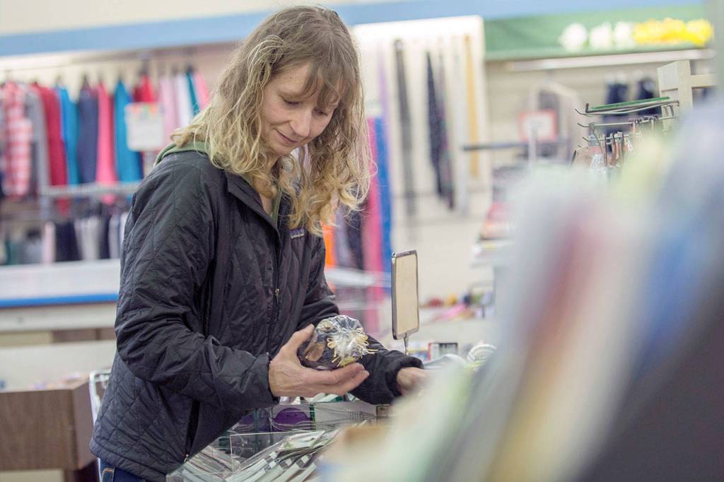 Michele Adolphsen, who owns Bay Variety in Port Angeles, organizes merchandise Tuesday. (Jesse Major/Peninsula Daily News)