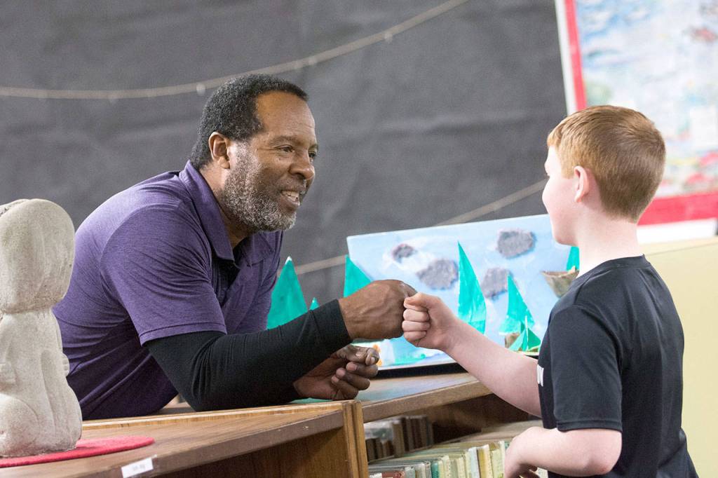 Hamilton Elementary School custodian Mike Daniels fist-bumps a student after lunch Wednesday. (Jesse Major/Peninsula Daily News)