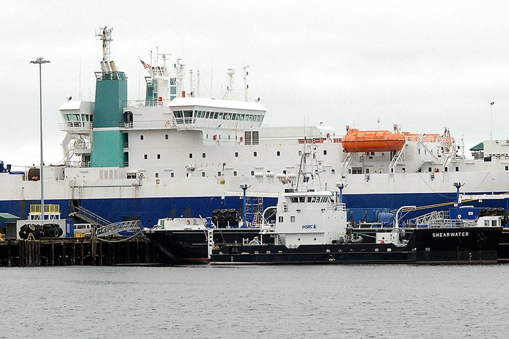 I met with and spoke to the captain of the ship a few months ago and a couple of features about Port Angeles made us an attractive option when they had to leave Victoria to comply with Immigration regulations: First and foremost the vessel and crew are still close enough to the contract area to be able to respond timely should a repair issue rear its ugly head and secondly the Port has shore power available for the vessel.