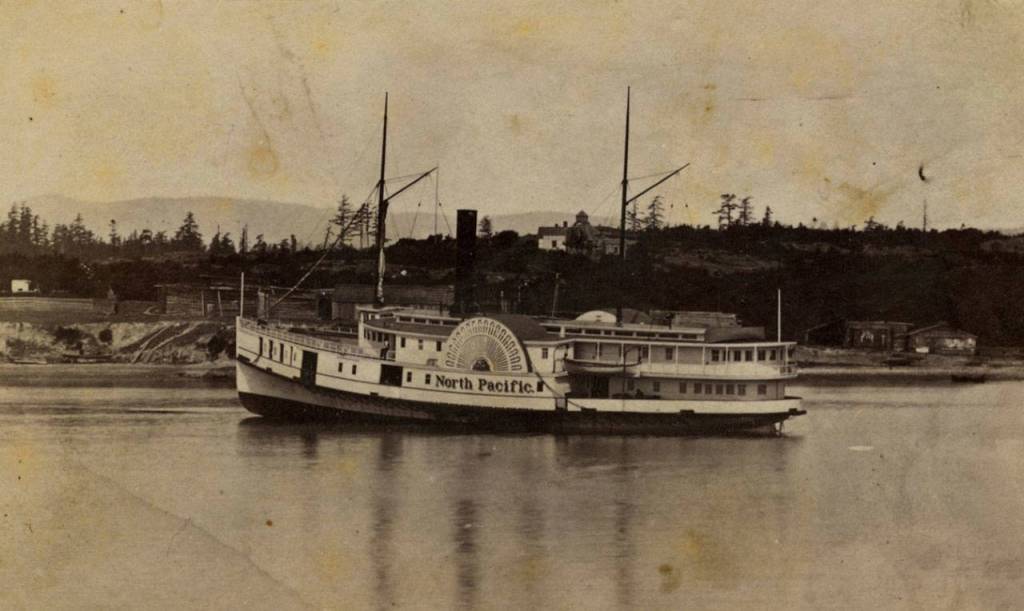 The Puget Sound side-wheeler steamer North Pacific is shown in the late 19th century. It was one of the ships serving Puget Sound ports used by opium smugglers. (Jefferson County Historical Society)
