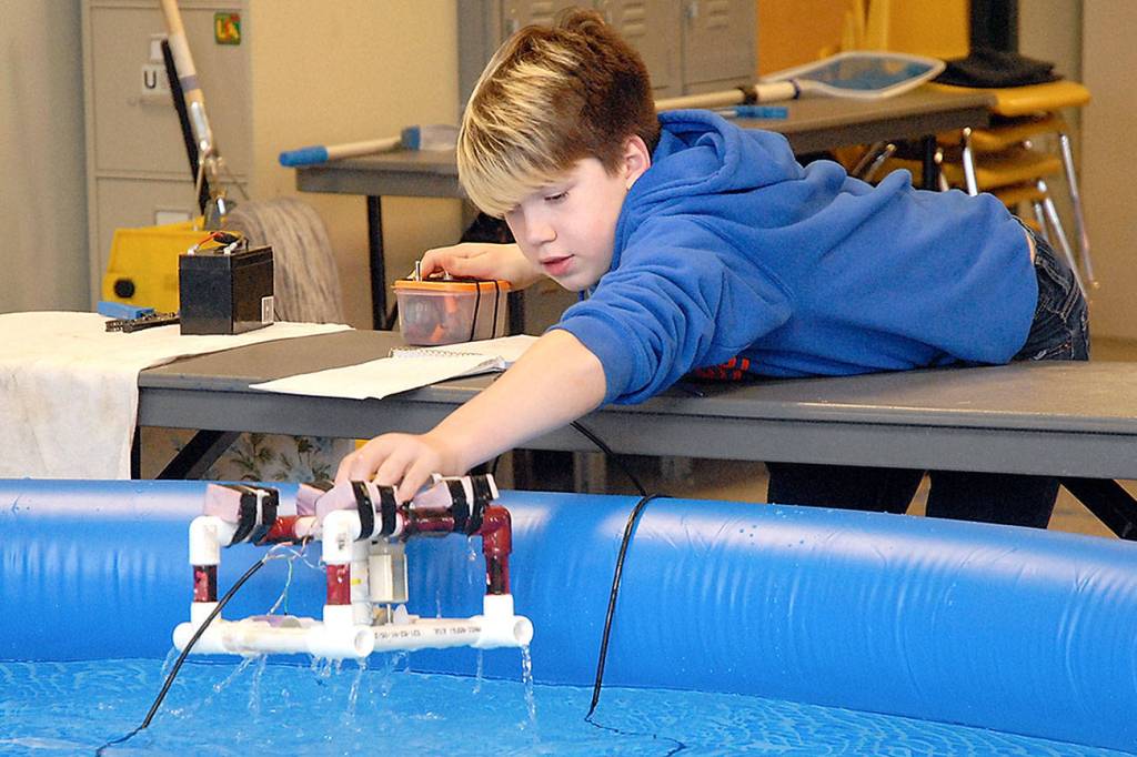 Jack Clemens, 12, a seventh-grade student at Stevens Middle School, pulls his homemade remotely operated underwater vehicle from a pool set up in an unused classroom area at Lincoln Center in Port Angeles on Wednesday. He is part of a contingent of four teams from Stevens and two from Port Angeles High School preparing to take part in a regional ROV competition on June 9 at Olympic High School in Bremerton that tests the engineering and piloting skills of youth submariners from around northwest Washington. (Keith Thorpe/Peninsula Daily News)