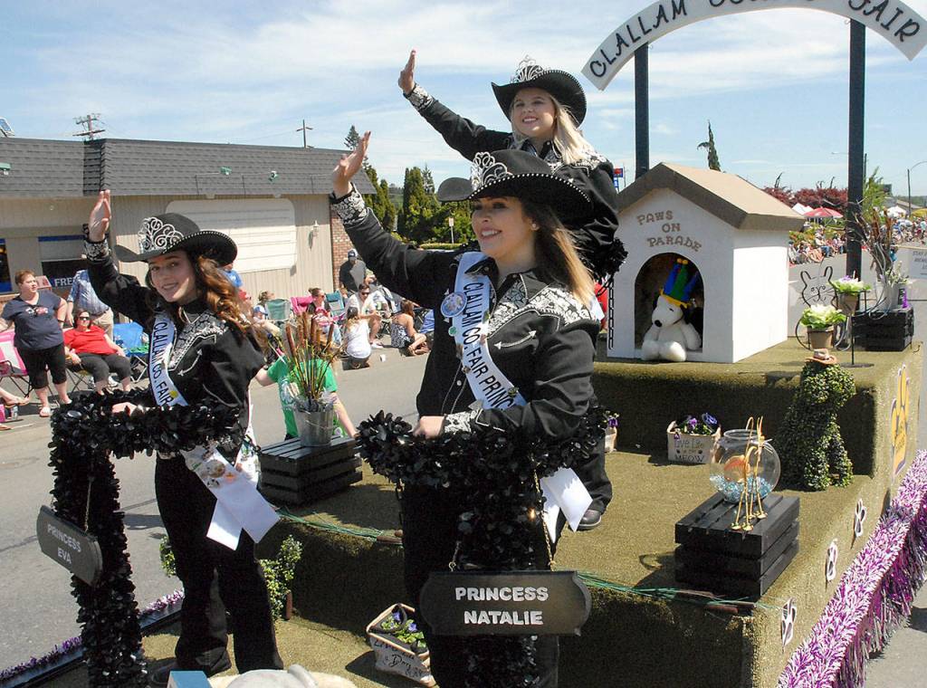 Clallam County Fair royalty, from left, princesses Eva O’Neil and Natalie Blankenship, and Queen Samantha Winger, rear, wave from their float in Saturday’s Irrigation Festival Parade. (Keith Thorpe/Peninsula Daily News)