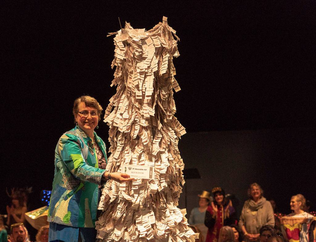 The dress is constructed with tickets from the Rose Theater in Port Townsend. Nadia plans on saving the prize money.