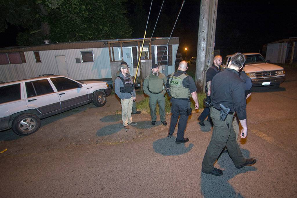 Local and federal law enforcement served search warrants and arrested multiple people at the Welcome Inn RV Park in Port Angeles late Wednesday night. (Jesse Major/Peninsula Daily News)