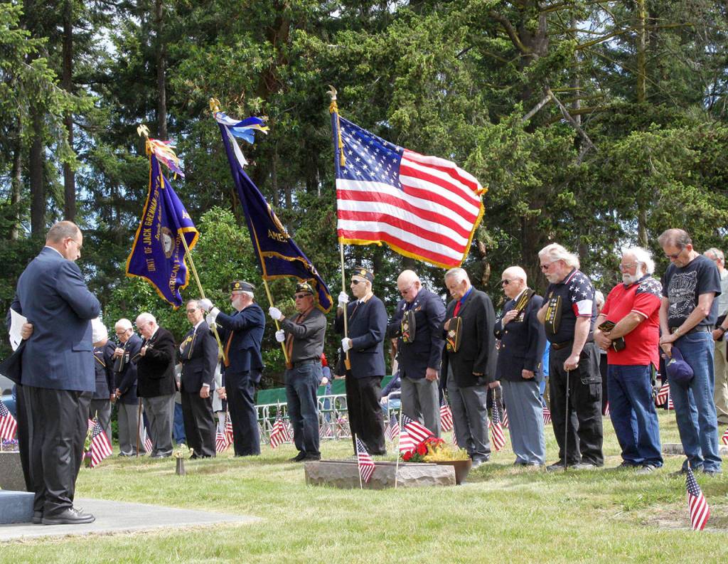 PORT ANGELES — Surrounded by American flags decorating the graves of veterans buried at Mount Angeles Memorial Park on Monday, about 100 people honored the men and women who have died while serving their country.