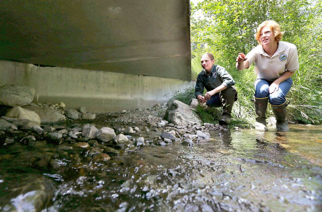 Julie Henning, right, division manager of the Washington Department of Fish and Wildlife ecosystem services division habitat program, and Melissa Erkel, left, a fish passage biologist, look at a wide passageway for the north fork of Newaukum Creek near Enumclaw. The Supreme Court is leaving in place a court order that forces Washington to restore salmon habitat by removing barriers that block fish migration. The justices divided 4-4 Monday in the long-running dispute that pits the state against Indian tribes and the federal government. (AP Photo/Ted S. Warren, file)